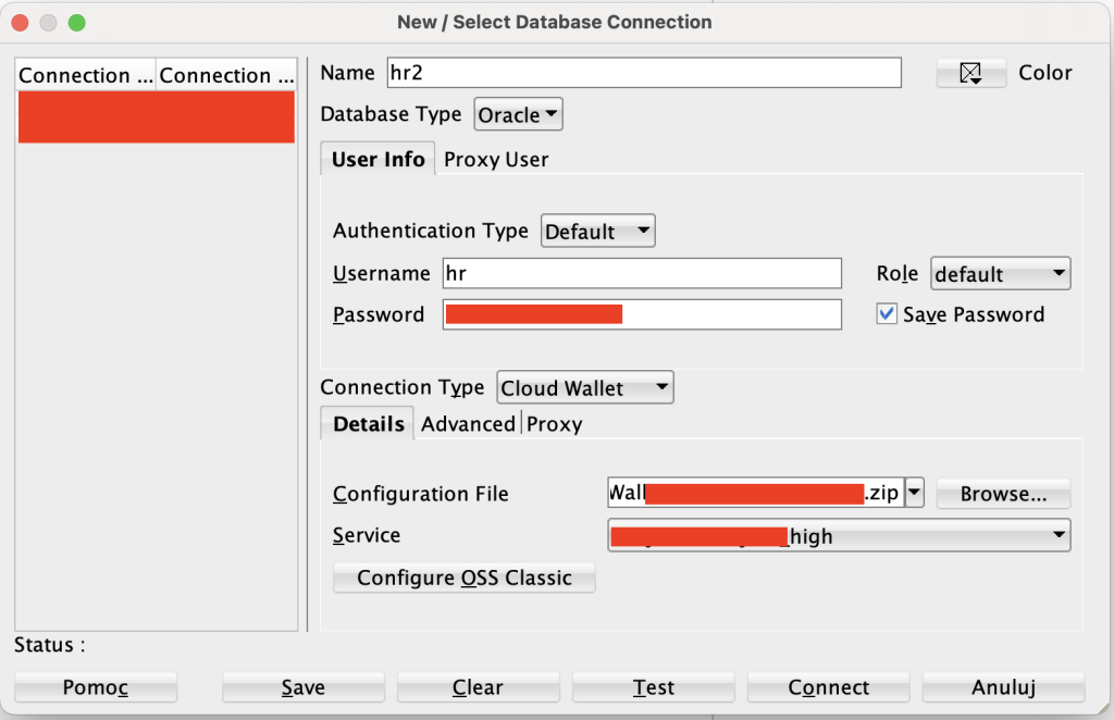 Następnie dokładnie tak jak w poprzednim poście łączymy się z bazą danych tylko zamiast loginu admin logujemy się na HR